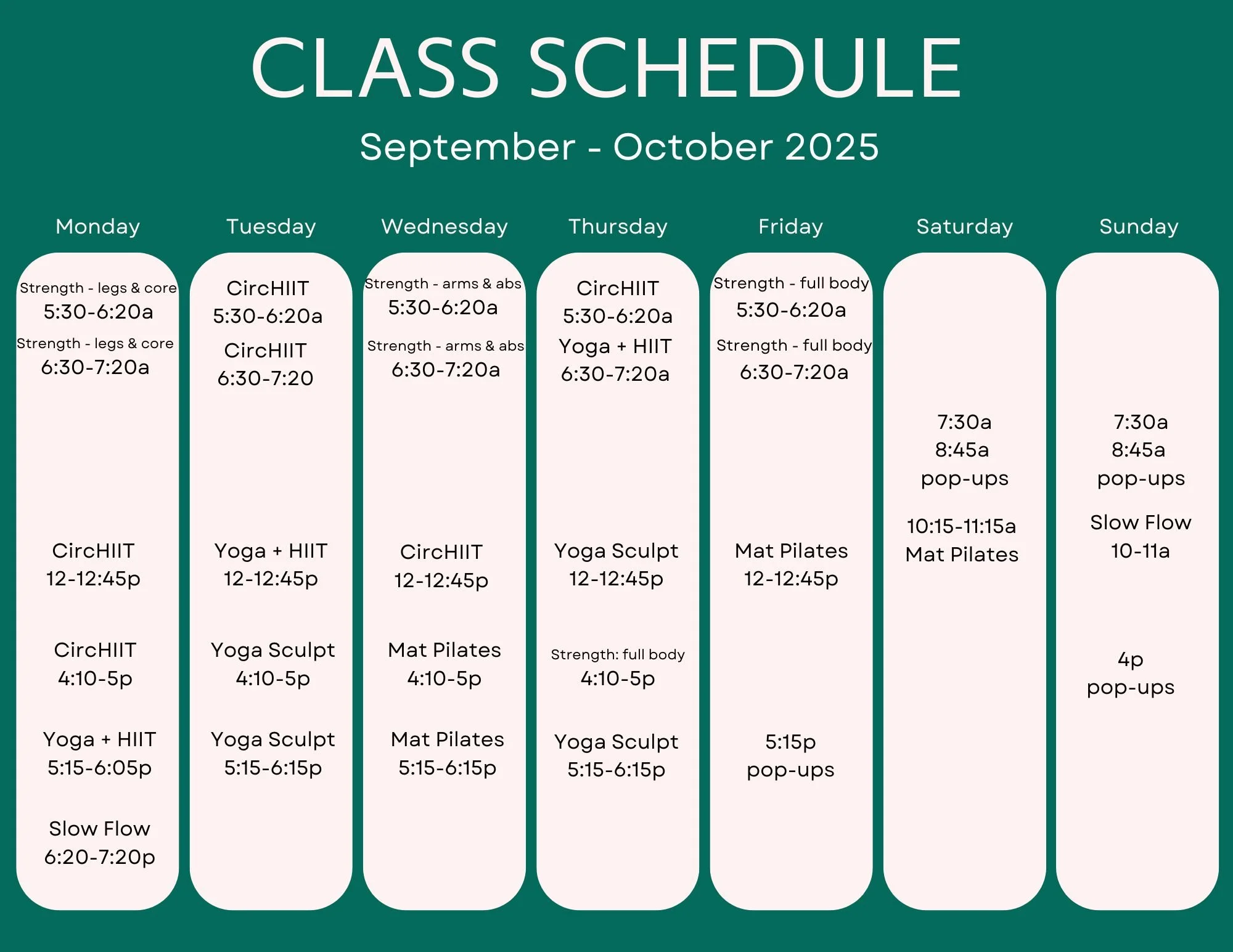 We offer a variety of HIIT & strength classes, with a touch of yoga & pilates.